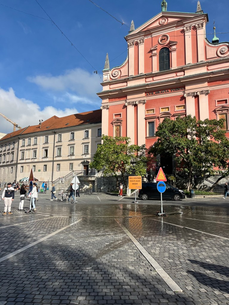 The wildest thing that has happened so far is seeing this very funny display in a square poking fun at the weather. Look closely and you’ll notice they’ve put up sprinklers above the sign that reads, “the area with Ljubljana’s own weather”