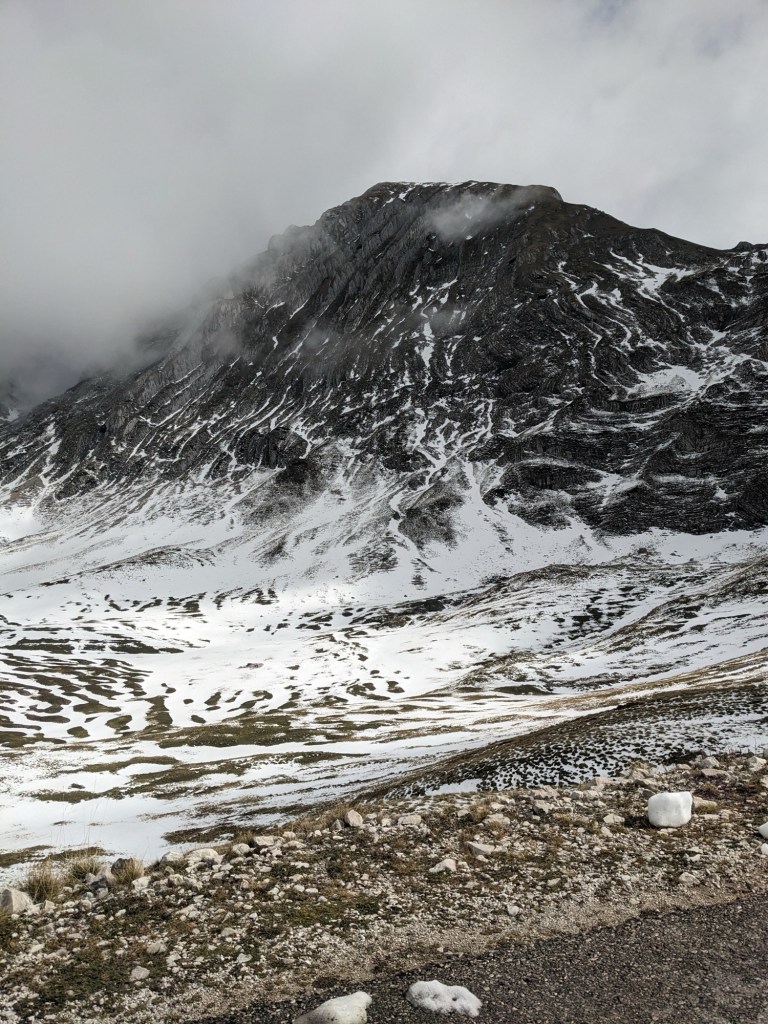 The mountains of Montenegro are beautiful! The first two biking days in Montenegro were especially lovely. The first day we climbed up out of Tara Canyon, onto a karst plateau, up through a pine forest sheltering snow, and again through karst meadows. The second day we wound through a misty wonderland of snow-dusted peaks. The clouds moved so fast that our view kept shifting, revealing a view for a moment and then snatching it back behind a curtain of fog.