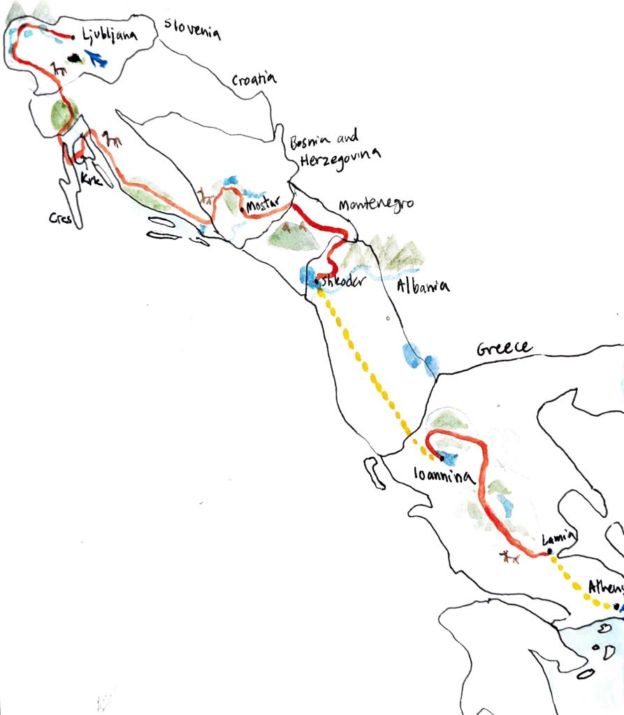 - Safety. Our reference routes largely did an excellent job of avoiding car traffic. The exception is some of the Trans Dinarica connector routes and secondary routes that are mostly road. For example, we found the coastal road in Croatia too unsafe to bike, as well as the Podgorica-Shkoder connection. We also heard multiple bad reviews of Eurovelo 8. Aside from traffic risk, there were three main route risks in the region that we routed to avoid: high winds (Bora winds of Croatia/Bosnia), grizzly bears (e.g. Velebit, Durmitor), and shepard dogs (wherever there are sheep and bears, so the mountains of Bosnia, Montenegro, Albania, and Greece). We want to have fun and explore, not needlessly suffer or take unnecessary risks.